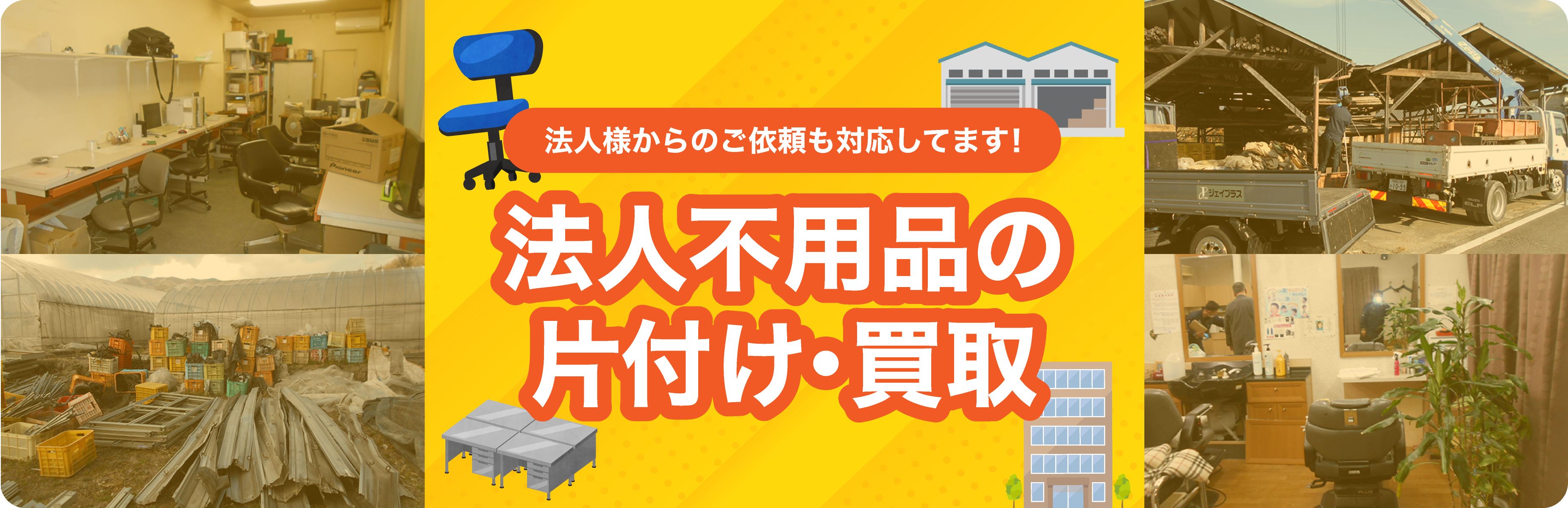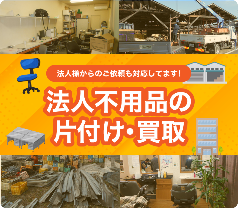 オフィスや工場・倉庫・事務所などの退去・移転の際に出る、不要品や片付け…お困りではありませんか?当社では、一般のご家庭だけでなく、法人さまからのご依頼にも対応しています!処分・買い取りなら当社にご用命ください。また、片付け後の原状復帰もお任せください。廃棄物に関しましてもマニフェスト対応です。